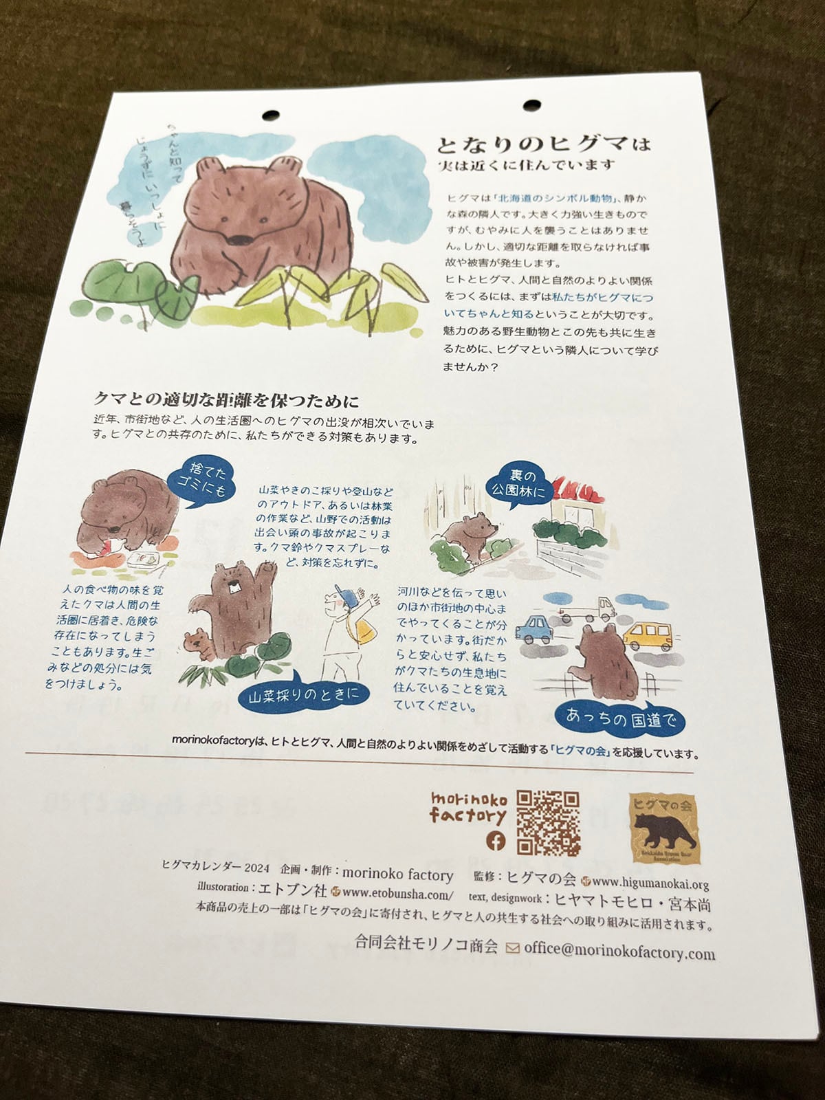 ヒトとヒグマ、人間と自然のよりよい関係をめざして活動する「ヒグマの会」の活動を応援、カレンダー1部につき100円が、morinoko factoryからヒグマの会に活動応援資金として寄付されます。